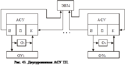 В 1-м случае СУ нижнего уровня подчиняется командам ЭВМ верхнего уровня и не могут принять своё решение. Достоинством таких АСУ ТП является простота организации, надёжность, низкая стоимость. Недостатки: в случае выхода ЭВМ из строя одной из АСУ нижнего уровня большой выход брака, определяющийся большим временем цикла обращения к данной АСУ.