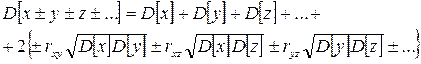 где rxy, rxz, rxy,... — коэффициенты корреляции соответствующих пар ху, xz, yz... случайных величин, входящих в рассматриваемую сумму (разность) этих величин.