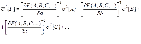 Если при определении действительных значений аргументов A, В, С,... систематические погрешности были исключены, то М [DA] = М [DB] = М [DC] =... = 0. В этом случае М [Y] = Yи и, следовательно, значение Y=F (А, В, С,...) можно принять за оценку действительного значения косвенно измеряемой величины. Что касается дисперсии полученного результата Y, то вычислить ее непосредственно по выражению (14-22) нельзя, так как для расчета значений частных производных требуется знание истинных значений аргументов. Вместо истинных значений аргументов известны их оценки A, В, С,.... Поэтому вместо значений