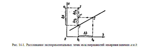 Сначала рассмотрим влияние погрешностей измерения а i и bi на рассеивание экспериментальных точек относительно исследуемой зависимости. Предположим, что мы хотим измерить величину а при b = bi. Если измерения выполняются без погрешностей, то, установив значение bi, получим значение величины а, соответствующее координатной точке 1 (рис. 14-1), лежащей на исследуемой зависимости. Теперь допустим, что величина а измеряется без погрешности, а величина b с погрешностью. Тогда при установке значения bi истинное значение величины b может оказаться равным bи за счет погрешности Db. Значение величины а при этом будет соответствовать координатной точке 2, лежащей на исследуемой зависимости. Однако, полагая, что мы установили значение bi, вместо