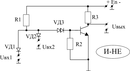 Сопротивление R2 обеспечивает смещения потенциала напряжения на базе и соответственно катода VД3. R3 ограничивает коллекторный ток, при подаче на один из входов хотя бы одного нулевого потенциала соответствующий диод VД1 или VД2 открывается и потенциал анода VД3 равен нулю, потенциал базы VT1 равен нулю. Транзистор закрыт. Uвых=1.