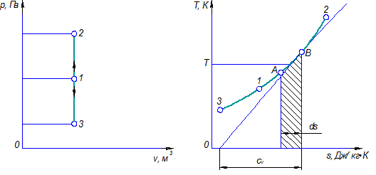 т.е. в Тs – координатах (рисунок 4.1) изохорный процесс описывается логарифмической зависимостью. При ds > 0 (процесс 1–2) теплота подводится к рабочему телу; при ds < 0 (процесс 1–3) теплота отводится. Подкасательная (отрезок сv – ds на оси абсцисс) определяет значение теплоемкости. Площадь под кривой процесса в TS – координатах (заштрихованная площадь) определяет количество теплоты, которое подводится в этом процессе (с учетом масштаба диаграммы).