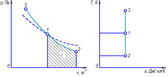 Поскольку при адиабатном процессе. dq = 0, то ds = 0, следовательно, s = const. Адиабатный обратимый процесс является изоэнтропным, т.е. протекает при постоянном значении энтропии. На рисунке 4.4 линия 1–2 соответствует расширению рабочего тела (процесс сопровождается уменьшением температуры), а линия 1 –3 – сжатию рабочего тела. Согласно уравнению с = dq/dT, при адиабатном процессе теплоемкость равна нулю.
