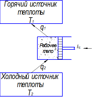 Поскольку в обратном цикле сжатие рабочего тела происходит при более высокой температуре, чем расширение, работа сжатия, совершаемая внешними силами, больше работы расширения на величину площади abcd, ограниченной контуром цикла. Эта работа превращается в теплоту и вместе с теплотой q2 передается верхнему источнику. Таким образом, затратив на осуществление обратного цикла работу lц, можно перенести теплоту от источника с низкой температурой к источнику с более высокой температурой, при этом нижний источник отдаст количество теплоты q2, а верхний получит количество теплоты q1 = q2 + lц.
