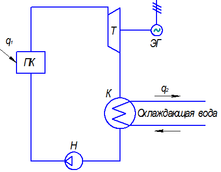 На рисунке 6.1 приведена схема паросиловой установки. Из парового котла ПК перегретый пар с параметрами p1, T1, h1 поступает в паровую турбину Т. При расширении в сопловом аппарате пар приобретает значительную кинетическую энергию, которая в роторе турбины превращается в техническую работу. Механическая энергия турбины превращается в электрогенераторе ЭГ в электрическую энергию. После турбины пар с давлением р2 и энтальпией h2 поступает в конденсатор К, представляющий собой теплообменник, в трубах которого циркулирует вода, охлаждающая пар.
