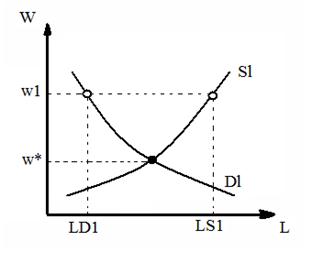 Безработица - это такое состояние рынка труда, при котором величина предложения (Ls1 ) больше величины спроса (Ld1) рис.12)..Безработица наряду с цикличностью, так же является фактором экономической нестабильности.