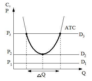 3. Такой, при котором при определенных объёмах выпуска покрывается определенная область средних издержек (см. рис.25). Цена здесь относительно высокая. И принято говорить, что рыночная конъюнктура для предприятия благоприятная. При таком варианте положения фирма будет производить продукцию. Условия, при которых предприятия будет производить продукцию, когда не будет и в каких случаях отсутствуют рыночные стимулы производственной активности.