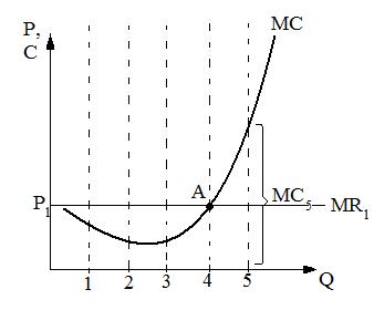 Предприятие производит и реализует первую единицу, при этом оказывается, что предельные издержки меньше предельного дохода MC < MR. При второй единице происходит тоже самое, третья единица даёт тот же самый результат, при четвертой единице предельные издержки и предельный доход совпадают, а при пятой единице предельные издержки больше предельного дохода.