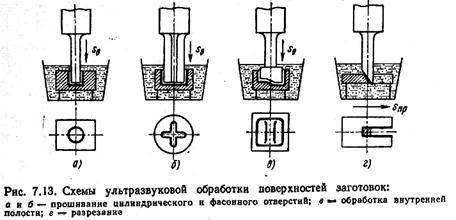 Ультразвуковым методом обрабатывают (рис. 7.13) сквозные и глухие отверстия любой формы поперечного сечения (а, б), фасонные полости (в), разрезают заготовки на части (г), профилируют наружные поверхности, гравируют, прошивают отверстия с криволинейными осями, нарезают резьбы.