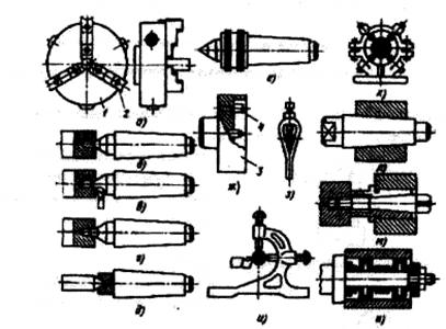 Опорные центры делают с твердосплавными наконечниками, срезанные центры применяют для обтачивания торцев, шариковые - для обтачивания конических поверхностей методом сдвига задней бабки, обратные - при обработке небольших диаметров.