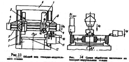 1-станина,2-стойка, 3-траверса,4 и 9-коро6ки подач,5 и 7-суппорты, 6-перемычка, 8-револьверная головка,11-боковой суппорт с 11-коробка подач, 12-карусель.