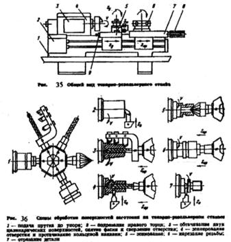 Станки с многогранной головкой имеют один или два поперечных суппорта. Все инструменты, работающие с продольной подачей закрепляются в револьверной головке (проходные и расточные резцы, сверла, зенкеры, метчики, развертки и т.д.), все работающие с поперечной подачей (отрезные, подрезные, фасонные, галтельные, прорезные и др.) в резцедержателе поперечного суппорта. Рис.36