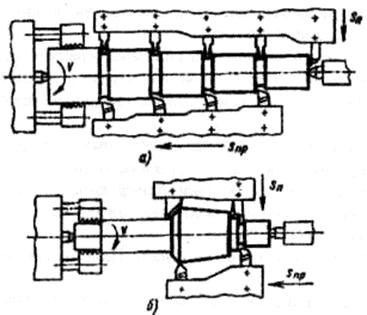 Имеется два суппорта - нижний и верхний. Нижний имеет только продольную подачу, верхний - поперечную На нижнем проходные резцы, на верхнем - подрезные, прорезные, фасонные, галтельные, для фасок. При наладке резцы устанавливают так, чтобы одновременно обрабатывалось несколько поверхностей. На многорезцовых полуавтоматах обтачивают только наружные поверхности заготовок: цилиндрические, конические, фасонные, плоские торцовые, кольцевые канавки, галтели, фаски.