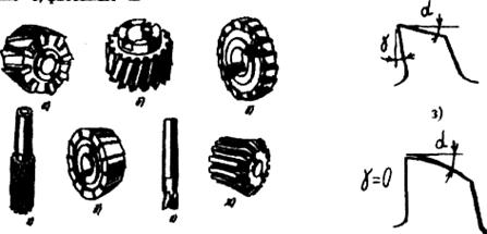 По форме, режущих зубьев фрезы делят на две основные группы: фрезы с остроконечными зубьями- з и фрезы с зятылованными зубьями -к. Фрезы с остроконечными зубьями передняя и задняя поверхности имеют плоскую форму (цилиндрические, торцовые, дисковые и др.) Фрезы с затылованными зубьями - передняя поверхность плоская, а задняя имеет форму архимедовой спирали.α-задний угол,γ- передний угол.