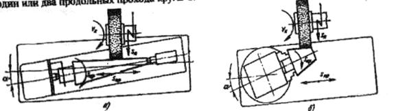 Наружные конические поверхности шлифуют по двум основным схемам Рис.. При обработке в центрах верхнюю часть стола поворачивают на угол, так чтобы образующая совпадала с направлением продольной подачи. При консольном закреплении заготовок, на α поворачивается только передняя бабка.