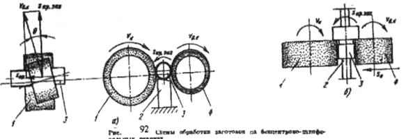 Некоторую трудность представляет шлифование малых отверстий. Требуется высокая частота вращения - десятки и сотни тысяч оборотов в минуту Применять развертки. Обработка на бесцентрово-шлифовальвых станках. Тип 3181, диаметр обрабатываемой заготовки до 60мм, характеризуется высокой производительностью. Заготовку обрабатывают в незакрепленном состоянии. Заготовку устанавливают на нож между ведущим и рабочим кругом. Наклон ведущего круга θ=1-7° Ступенчатые валы обрабатывают методом врезания.