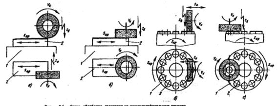 В промышленности применяют различные виды шлифования. Наиболее широко: наружное круглое, внутреннее и плоское. Способ применяется при шлифовании цилиндрических и конических деталей. Должны быть обеспечены равномерное вращение детали и круга, продольная подача заготовки и поперечная круга. Скорость резания