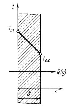 В стационарных условиях, когда энергия не расходуется на нагрев, плотность теплового потока q неизменна по толщине стенки.