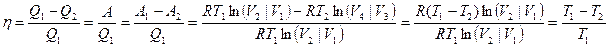 Q1 – Q2 и произвело работу А = А1 – А3 (так как А2= А4) (применяя закон Бойля и уравнение адиабаты заменяем V4|V3 на V2|V1)