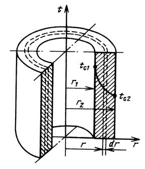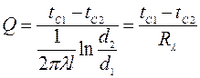 Интегрирование уравнения (9.16) в определенных пределах (по t от tc1 до tС2 и по r от r1 до r2) дает зависимость для расчета теплового потока через цилиндрическую стенку: