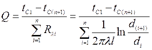 Для определения теплового потока через многослойную цилиндрическую стенку следует, как и для многослойной плоской стенки, просуммировать термические сопротивления отдельных слоев: