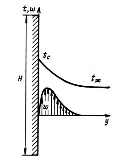 Рис. 10.1 – Распределение скоростей и температур теплоносителя около вертикальной теплоотдающей поверхности при естественной конвекции