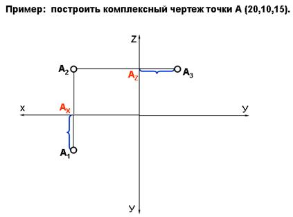 Если все координаты точки имеют числовые зна чения, то точка расположена в пространстве. Если точка имеет одну нулевую координату, то точка принадлежит плоскости проекций.