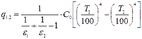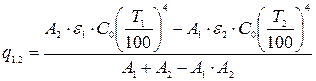 Будем считать, что степень черноты обеих поверхностей не меняется в диапазоне температур от Т1 до T2. Следовательно, по закону Кирхгофа A1 = ε1 и A2 = ε2– Заменяя А на ε и вынося ε1 ε2 Со, получаем