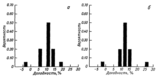 Возможные значения доходности проекта 1 принадлежат промежутку от -3.0 до +19.0%, а проекта 2 – от -2.0 до +26.0%. Отметим, что высота каждого столбца представляет собой вероятность появления соответствующего исхода, а сумма этих вероятностей по каждому варианту равна 1.00. Отметим также, что распределение значений доходности проекта 2 симметрично, тогда как соответствующее распределение для проекта 1 имеет левостороннюю асимметрию.