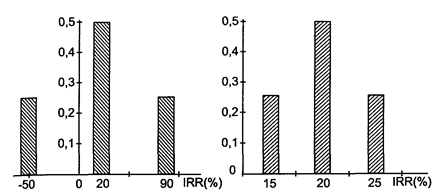 Как видим, для второго проекта с вероятностью 68,26% можно ожидать величину доходности IRR = 20% ± 3,5%, т.е. от 16,5% до 23,5%. Риск здесь минимальный. Проект А гораздо более рискованный. С вероятностью 68,26% можно получить доходность от -29,5% до 69,5%. Считается, что среднерискованной операции соответствует значение s около 30%.