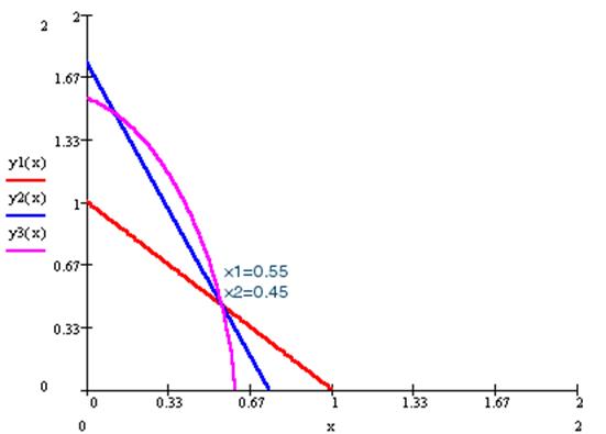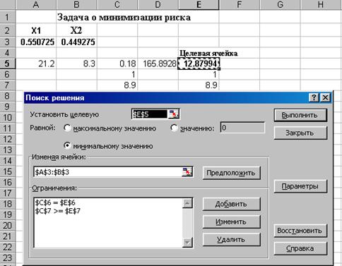 Рис. 4.3. Минимальный риск портфеля равный 12.88% достигается в точке пересечения линий (Х1=0.55 и Х2=0.45), соответствующих ограничениям X1 + X2 =1 и 12´X1 + 5.1´X2 ³ 8.9 и целевой функции.