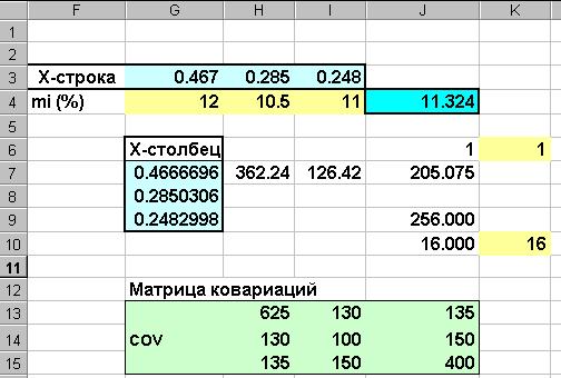 Для решения задачи следует воспользоваться надстройкой EXCEL Поиск решения [10]. В результате решения получена максимально возможная доходность портфеля 11.29 при значениях вектора Х, записанных в ячейки $G1:$I1 (Рис. 4.5.)