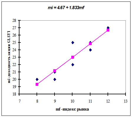 Используя данные таблицы 4.3, полученную рыночную модель можно записать в виде mi = 4.667 + 1.833 ´mr. Следовательно, b- коэффициент акции GLSYTr равен 1.833.