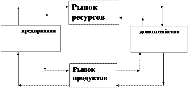 Цены, уплачиваемые за использование земли, труда, капитала и предпринимательской способности на ресурсном рынке, показанном в верхней части диаграммы. Здесь предприятия выступают в роли предъявителей спроса, а домохозяйства – в роли агентов предложения. Цены на готовые изделия и услуги формируются на рынке продуктов, показанном в нижней части диаграммы. Здесь уже домохозяйства выступают в качестве предъявителей спроса, а предприятия в роли агентов предложения.