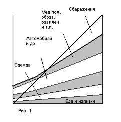 В чем состоят различия в структуре расходов на потребление среди различных домашних хозяйств. Не существует двух семей, расходующих свой располагаемый доход в точности одинаково. Те мне менее, статистики показывают, что существуют предсказуемая регулярность в том, как люди распределяют свои расходы между продовольствием, одеждой и другими важными видами благ. Тысячи исследований структуры расходов домашних хозяйств подтверждают удивительное единообразие, касающееся общих, качественных характеристик их поведения в этой сфере. Эта закономерность отображена на рис. 1.