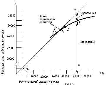 На рис. 2 точкой постоянного богатства является точка В. В этой точке расходы на потребление в точности равны располагаемому доходу: домашнее хозяйство ни заёмщик, ни сберегатель. Правее точки В, функция потребления лежит ниже 450-ной линии. Связь между доходом и потреблением можно увидеть, рассмотрев вертикальную линию, проведённую на рис. 2 из точки E’ до E. При доходе, равном 28,000., уровень потребления составляет 27,240 долл. (см. табл.). Мы можем убедиться, что потребление меньше, чем доход, на основании того факта, что в точке Е график функции потребления ниже, чем 450-ная линия.