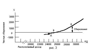 Функция сбережений можно получить, используя рис. 2. График этой функции представляет собой расстояние по вертикали между 450-ной линией и графиком функции потребления. Например, мы можем видеть, что в точке А на рис. 2 сбережения отрицательны, поскольку график функции потребления лежит ниже 450-ной линии. Рис. 3 непосредственно иллюстрирует это расходование сбережений: график функции сбережений в точке А расположены ниже линии нулевых сбережений. Аналогичным образом, правее точки В сбережения положительны, т.к. функция сбережений находится выше линии нулевых сбережений.