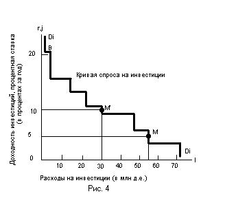 Результаты нашего анализа изображены на рис. 4, который иллюстрирует кривую спроса на инвестиции; она является здесь ступенчатым графиком функции, зависящей от ставки процента. Данный график показывает сумму инвестиций, которые будут осуществлены при той или иной процентной ставке; эта сумма вычисляется посредством сложения объёмов инвестиций, которые будут прибыльны при каждой ставке процента.