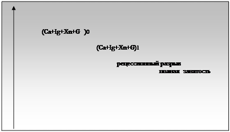 Величина, на которую совокупные расходы меньше, чем объем ВВП при полной занятости, называется рецессионным разрывом, поскольку этот дефицит расходов приводит к сокращению и замедлению экономической активности. В Табл.2 исходим из того, что уровень ВВП при полной занятости равен 150млрд.д.ед. (столбец 1), а соответствующий уровень совокупных расходов составляет только 505млрд.д.ед. (столбец 9). Рецессионный разрыв равен 5млрд.д.ед., то есть величине, на которую сместилась бы верх кривая совокупных расходов, чтобы достичь уровня ВВП при полной занятости. На Рис.5 рецессионный разрыв представляет собой расстояние, на которое кривая совокупных расходов (Сa +Ig+Xn+G)1 проходит ниже точки полной занятости, расположенной на биссектрисе. Поскольку мультипликатор равен 4, видно, что разница между равновесным ВВП и ВВП при полной занятости составляет 20млрд.д.ед. (рецессионный разрыв в размере 5млрд.д.ед., умноженный на мультипликатор, равный 4). Этот разрыв в 20млрд.д.ед.составляет величину отставания ВВП.