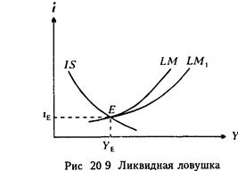 Допустим, первоначально рынки товаров и денег находятся в равновесии в точке пересечения кривых IS и LМ – в точке Е (рис.20 9). Предположим, увеличилось предложение денег. Это обусловило сдвиг кривой LМ вправо, в положение L M1 Но так как кривая имеет почти горизонтальный участок, то этот сдвиг не приведет к сколько-нибудь существенному снижению процентных ставок, объем инвестиций и национального дохода останутся на прежнем уровне. Следовательно, в данном случае изменение предложения денег не меняет реальный национальный доход. Такая ситуация получила название ликвидной ловушки. На нее ссылались ранние последователи Кейнса, когда доказывали неэффективность денежно-кредитной политики.