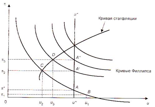 Если государство предпримет новые шаги по сокращению безработицы до уровня u3, то уровень инфляции уже составит p3. На кривой Филлипса комбинации u3, p3 будет соответствовать точка D. После индексации заработной платы и сокращения занятости до u* кривая Филлипса снова сдвинется вправо и пройдет через точку А". Дальнейшие подобные действия государства будут вызывать аналогичные последствия: за каждой попыткой сократить безработицу будет следовать рост цен и возвращение безработицы к естественной норме.