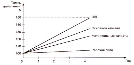 тип экономического роста. Экономисты различают два типа роста' экстенсивный (когда рост обеспечивается за счет количественного наращивания экономических ресурсов) и интенсивный (увеличение объемов выпуска вследствие качественного улучшения имеющихся ресурсов). Однако в чистом виде ни один из этих типов роста не встречается, поэтому речь может идти лишь о преимущественно экстенсивном или преимущественно интенсивном экономическом росте,