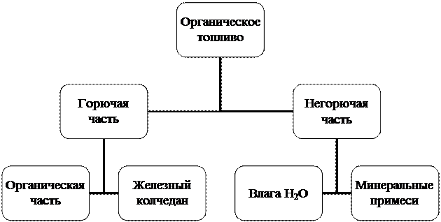 Органическое топливо состоит из горючих элементов (водород H, углерод С, сера S)и негорючих (кислород О и азот N ). Кроме того, в состав топлива входят влага W и зола A.