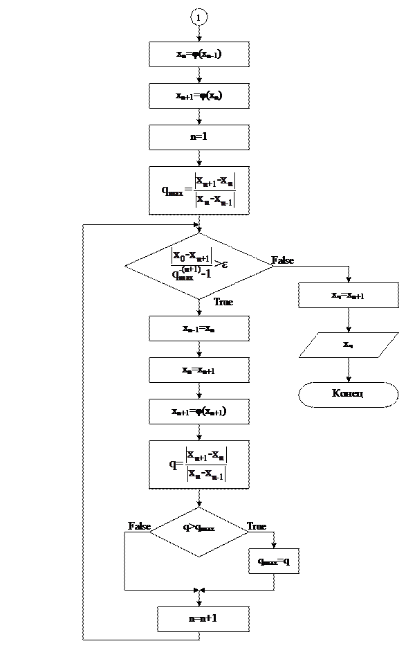 Неравенство (13) является условием остановки процесса итераций, т.е. условием достижения заданной точности. В завершение рассмотрения данного метода остаётся только построить блок-схему его алгоритма. Будем считать, что |φ′(xт)|<1, x0Î(xт-Δ,xт+Δ).