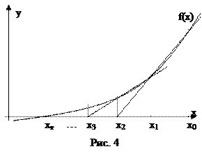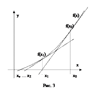 Метод Ньютона называют также методом касательных и методом линеаризации. Суть метода заключается в том, что в точке приближения к функции строится касательная (Рис. 3). Следующая точка приближения – это точка пересечения полученной прямой с осью Ox. Процесс продолжается вплоть до достижения заданной точности.
