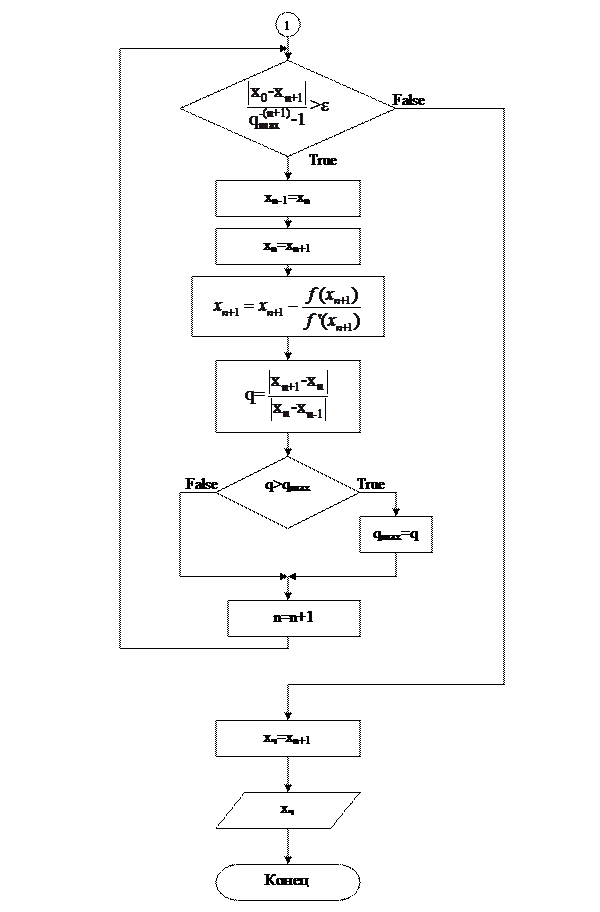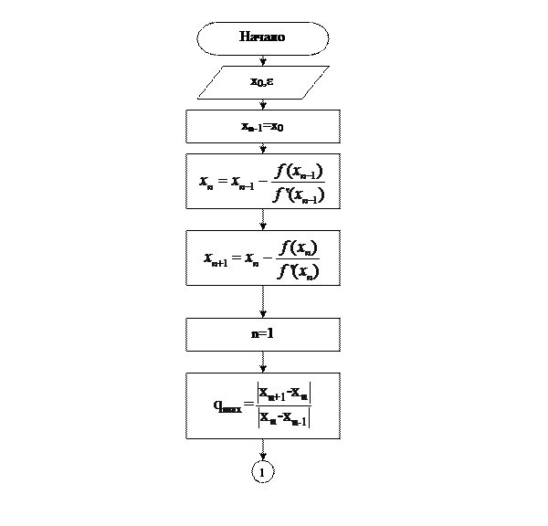 Рассуждения по поводу выбора начального приближения в методе Ньютона такие же, как и в методе простых итераций, только вместо (11) используется (14). Для данного метода также применимо (13). Напишем блок-схему алгоритма метода Ньютона.