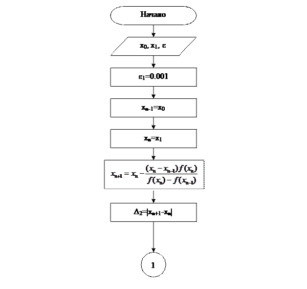 При использовании метода секущих в явном виде определить точность трудно, поэтому используют косвенный метод. Считают, что вблизи корня |xn+1-xn|~|x т -xn+1|. Конечно эта оценка весьма примерна, но при больших n (в идеале при n→∞) это так и есть. Построим блок-схему алгоритма данного метода с использованием приёма Гаврика.