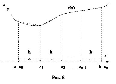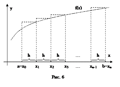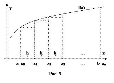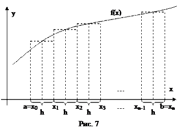 На рис. 5 проиллюстрирован, так называемый, метод левых прямоугольников. Его название объясняется тем, что высота прямоугольника f(x) вычисляется в левой границе отрезка h. Выведем формулу для приближённого вычисления интеграла I.