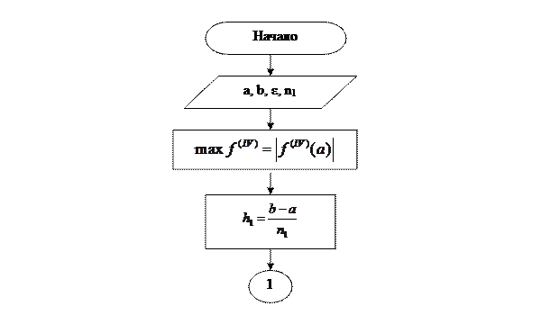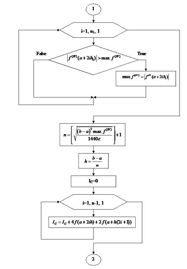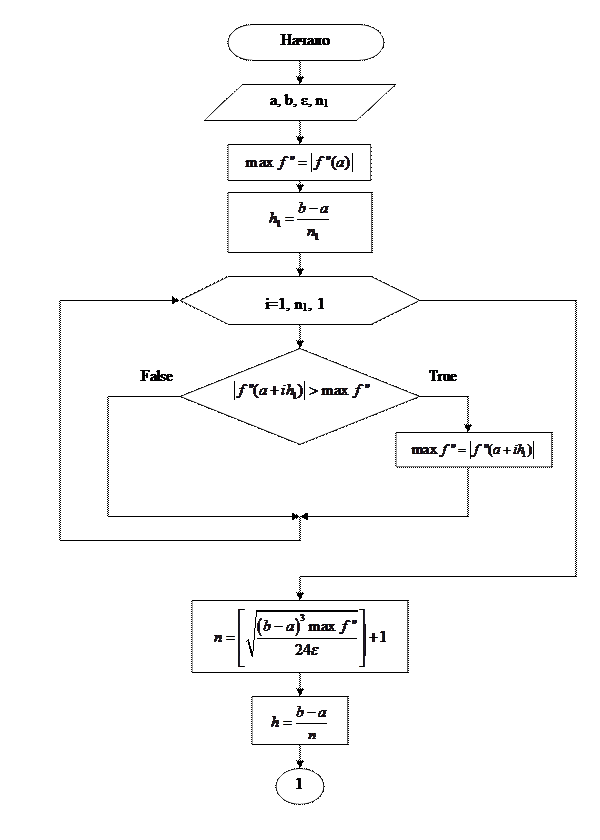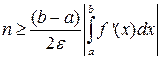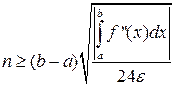Введём обозначение. [n] – целая часть n, полученная путём отбрасывания дробно части. Для вычисления интеграла дано ε, [a,b], f(x), f’’(x). Прежде всего, через ε необходимо получить n. Пользоваться формулой (32) мы не будем, т.к. в ней необходимо вычислять интеграл. Воспользуемся мажорантной оценкой (34). Для этого перед вычислением интеграла необходимо найти
