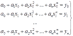 Для того, чтобы определить коэффициенты a0, a1,… необходимо решить систему из n уравнений с n неизвестными: